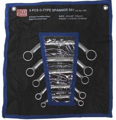 BGS Technic - GermanyKróm-vanádium acélból - szatén króm 5 db-os ";C"; alakú készlet. Méretek: 1 / 4 ";x5/16";, 3 / 8 ";x7/16";, 1 / 2 ";x9/16";, 5 / 8 ";x11/16"; , 3 / 4 ";x7 / 8"; Falra akasztható zsebes tárolóval.