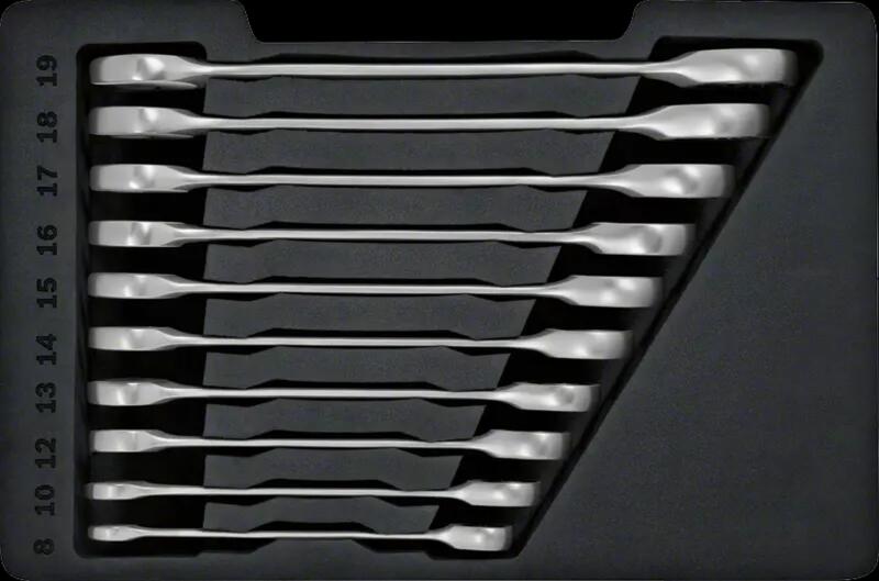 A sokoldalú, 10 részes készlet racsnis villáskulcsokat tartalmaz a leggyakoribb méretekben. Az összes villáskulcs sokféle alkalmazáshoz használható, mivel mindegyik villáskulcs egy termékben kombinálja a nyitott végét és a racsnis gyűrűs kulcsot. Minden csavarkulcs tökéletesen alkalmas szűk helyeken történő munkára, mivel a fogatlan racsnis csak 3 fokos lengési szöget igényel. A kiváló minőségű króm-vanádium acélból készült kulcsok edzett bi-hex gyűrűvel robusztusak és hosszú élettartamúak. A 10 részes készlet racsnis villáskulcsokat tartalmaz a következő általános méretekben: 8, 10, 12, 13, 14, 15, 16, 17, 18 és 19 mm. A készlet praktikus, fél méretű betétben érkezik, amely kompatibilis a Bosch L-BOXX mobilrendszerével.