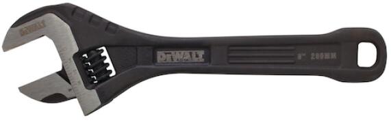 DWHT80267-0 *DEWALT Állítható villáskulcs, 8" (200 mm), teljesen acél kivitel *Anyag: króm-vanádium acél *Kialakítás: vékony pofák a szűk helyekhez *Mérőskála: lézerrel maratott, pontos beállításhoz *Markolat: csúszásmentes, kényelmes fogás *Maximális pofanyílás: 28 mm *Felhasználás: általános szerelési és karbantartási munkákhoz *Súly: 300 g