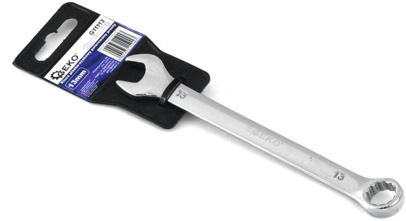 Kombinált csillag- villáskulcs 13 mm-es méretben. A 15°-os szögben elhelyezett lapos fej és a 15°-ban meghajlított gyűrűs fej megkönnyíti a kulccsal való mozgást a nehezen hozzáférhető helyeken történő csavarozáshoz. A villáskulcs króm-vanádium acélból készült. A termék jellemzői: Króm és vanádium ötvözet