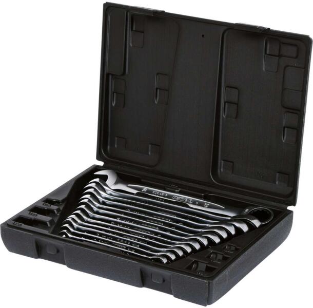 KS Tools GEARplus Kombinált Racsnis Kulcskészlet - 12 db, 8-19 mm Ez a 12 darabos KS Tools GEARplus kombinált racsnis kulcskészlet minden otthoni és profi szerelő számára nélkülözhetetlen. A króm-vanádium acélból készült kulcsok kiváló minőségűek, tartósak és pontosan illeszkednek. A 72 fogas mechanizmus könnyű és gyors munkavégzést tesz lehetővé. A készlet praktikus műanyag tárolóban érkezik. Jellemzők:FlankTraction profil: DIN 3113 / ISO 3318 szabvány szerint 15°-os pofa eltolás: Könnyebb hozzáférés szűk helyeken Egyenes forma: Optimális erőátvitel Pontos fogazás 72 foggal: Finom beállítás és gyors munka Króm-vanádium acél: Kiváló szilárdság és tartósság Tartós műanyag tároló tok: Praktikus tárolás és szállítás A készlet tartalma:Méret (mm) Cikkszám Darabszám8 503.4208 19 503.4209 110 503.4210 111 503.4211 112 503.4212 113 503.4213 114 503.4214 115 503.4215 116 503.4216 117 503.4217 118 503.4218 119 503.4219 1Szerezd be most ezt a kiváló minőségű racsnis kulcskészletet és könnyítsd meg a munkádat! ?️