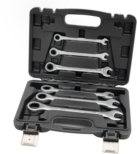Leírás A készlet 6 db racsnis villáskulcsot tartalmaz, amelyek még a nehezen elérhető helyeken is megkönnyítik a munkát. A szerszámok tartós és ellenálló króm-vanádium acélból készültek. Biztonságosan tárolhatóak és szállíthatóak a szerszámokhoz mellékelt erős műanyag kofferban. Tartalom Praktikus műanyag koffer 6db racsnis villáskulcs a következő méretekkel: 8mm, 10mm, 13mm, 14mm, 17mm, 19mm