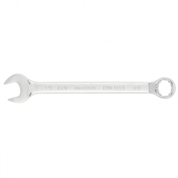 Matrix 15163 kombi villáskulcs, 19 mm, CrV acélból, polírozott króm felülettel, otthoni vagy garázsi felújítási munkák során hasznos. Ezzel gyorsan fel- és szétszerelheti a rögzítőket. A gyűrűs torok dőlésszöge a szerszám síkjához viszonyítva 15°, így a nehezen elérhető helyeken kényelmesen lehet csavarkulccsal dolgozni. Jellemzők: