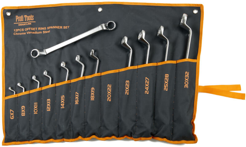 12 darabos 6-32 mm-es csavarkulcs készlet az otthoni és a professzionális műhelyekben való széleskörű alkalmazáshoz. A kulcsok kétoldalas, 70°-kal eltolt 12-pontos fejjel rendelkeznek a süllyesztett anyák kényelmes meghúzásához és meglazításához.