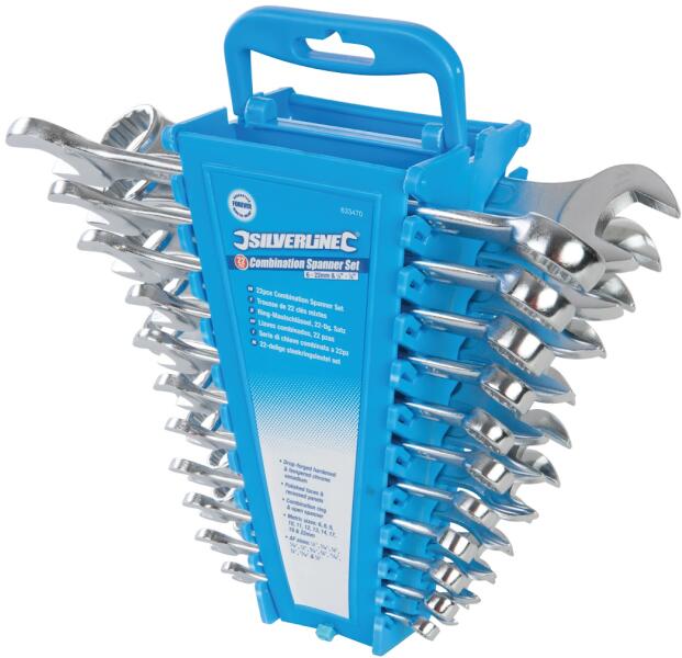 Kombinált lapos villáskulcsok és 12 szélű fűzőlyukak 15°-os elkerüléssel a jobb hozzáférés érdekében. Kovácsolt lapka kovácsolt, króm-vanádium acélból készült, edzett és edzett 43 -48HRC. Kiváló minőségű, teljesen polírozott felület. Hordozható tartó nagyon erős műanyagból. Tartalmazza a metrikus méreteket: 6, 8, 9, 10, 11, 12, 13, 14, 17, 19 és 22 mm. Méretben: 1/4", 5/16", 3/8", 7/16", 1/2", 9/16", 5/8", 11/16", 3/4", 13/16" és 7/8".