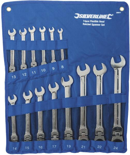 Edzett, temperált, krómozott, CrV-kulcsok, korrózióállóak, lehetővé teszik a könnyű hozzáférést szűk helyeken, 5°-os racsnis, 180°-os billenthető fej. Tartalmazott méretek: 8, 9, 10, 11, 12, 13, 14, 15, 16, 17, 19, 21, 22 és 24 mm, merev nejlon tárolódobozban szállítva.
