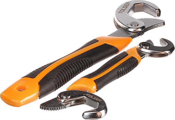 A készlet két önálló kulcsból áll. A kisebb kétoldalú terjedelme 9-14 és 15-22 mm, a nagyobb egyoldalú 23-32 mm. A kulcsokat úgy szerkesztették meg, hogy a nyomás három ponton egyszerre fejtse ki a hatását - ezzel biztosított a csavar biztos megfogását. Különleges rögzítőfejjel rendelkezik, amely azonnal alkalmazkodik bármilyen csavarhoz, alkalmas bármilyen cső megfogására, és univerzális szerszám autójavításnál. A kulcsok kiváló minőségű szénacélból készültek. Méretek: kicsi 215x36x16 mm, nagy 285x50x22 mm.